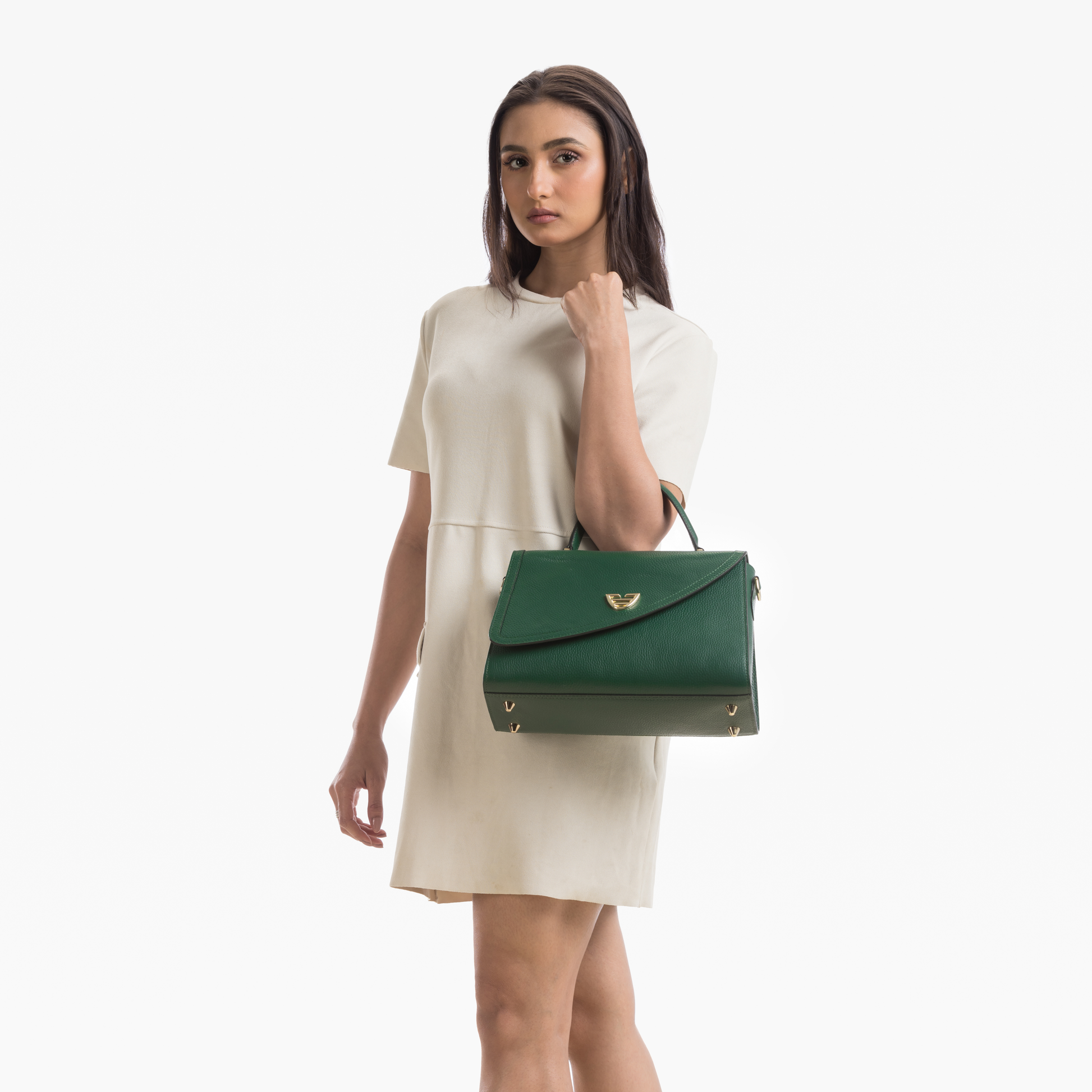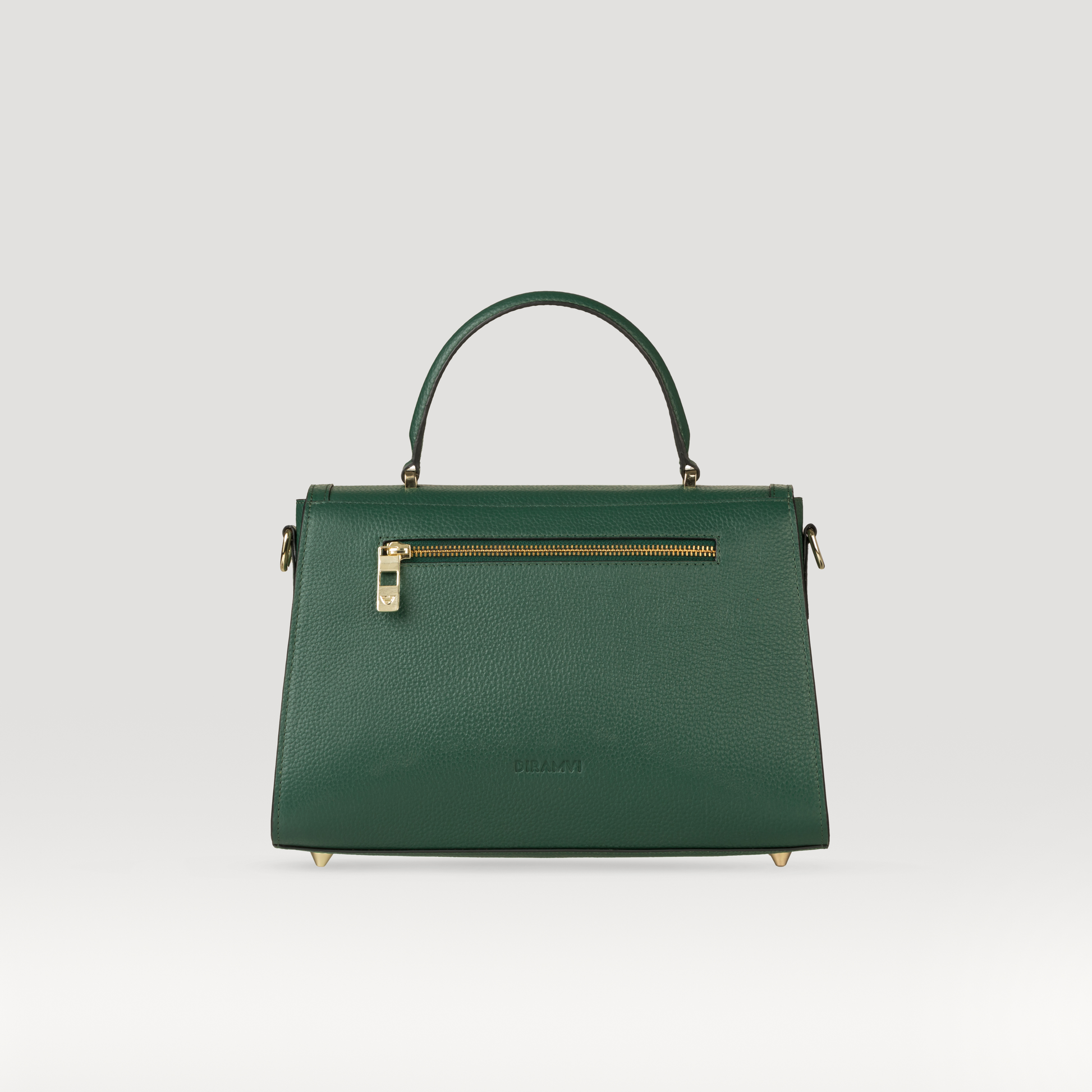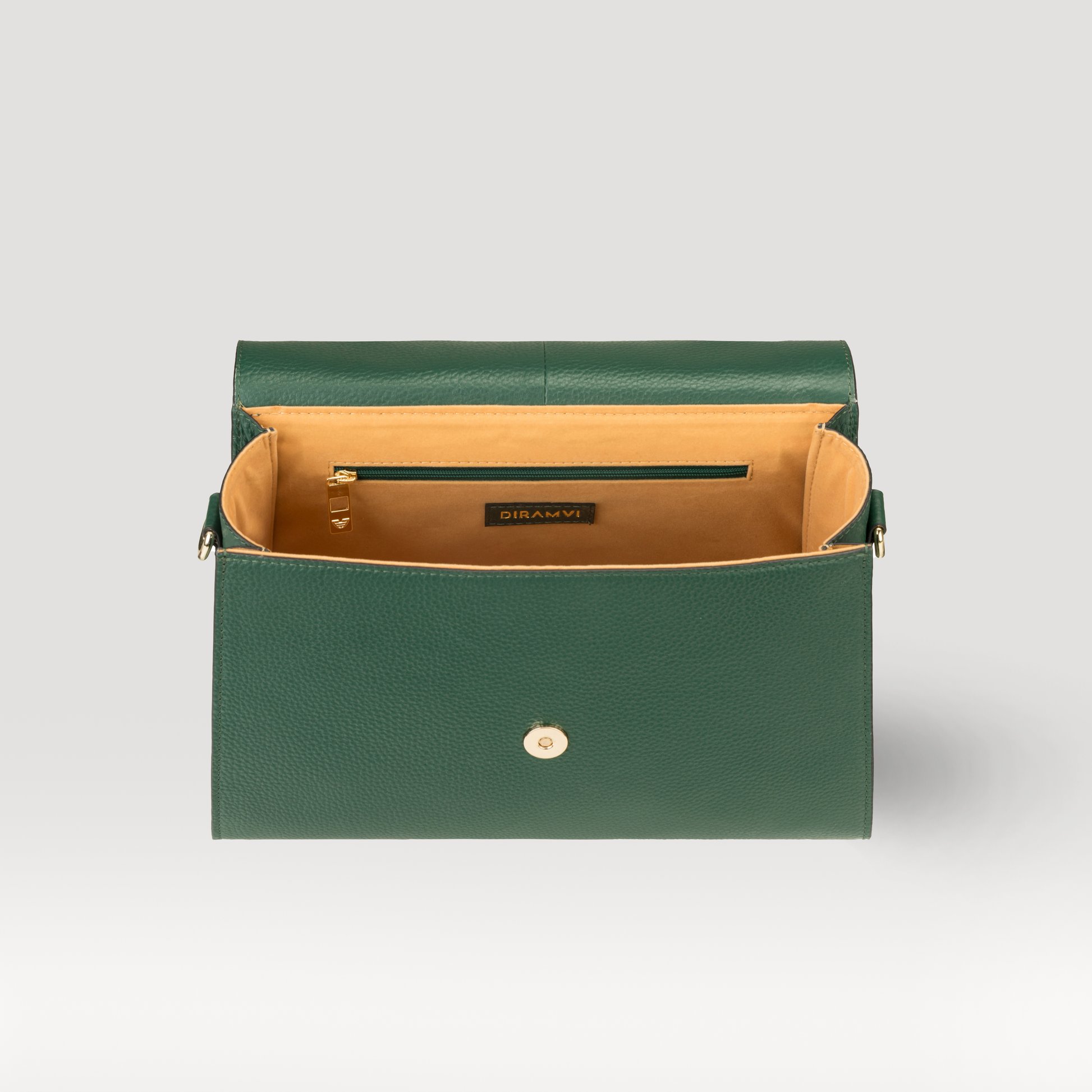The Dignity Evergreen is a masterpiece of timeless sophistication. The distinctive Dignity curve flap is punctuated by a lustrous gold-tone DIRAMVI "Ladder Of Growth" emblem. Whether worn crossbody or carried by hand, it's sturdy construction makes a perfect combination of style and convenience. It comes with a magnetic lock and sized to fit everyday items, which includes phone, wallet, makeup essentials and keys.