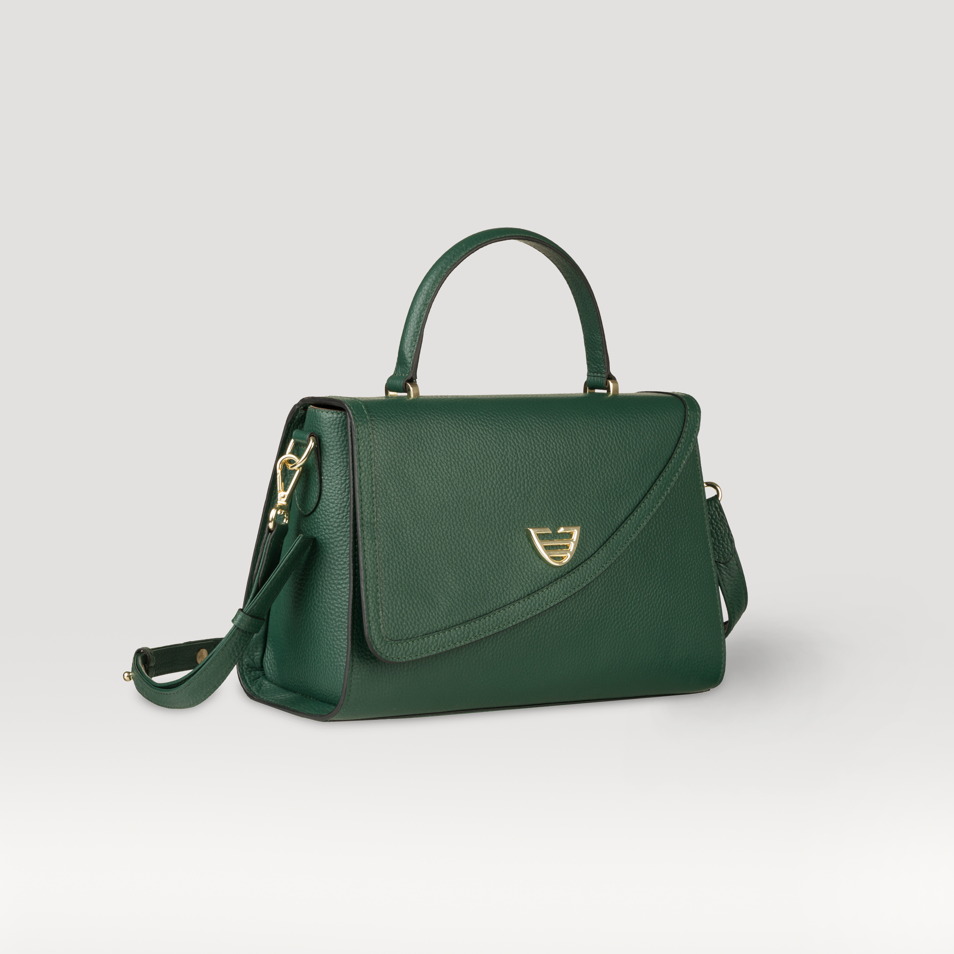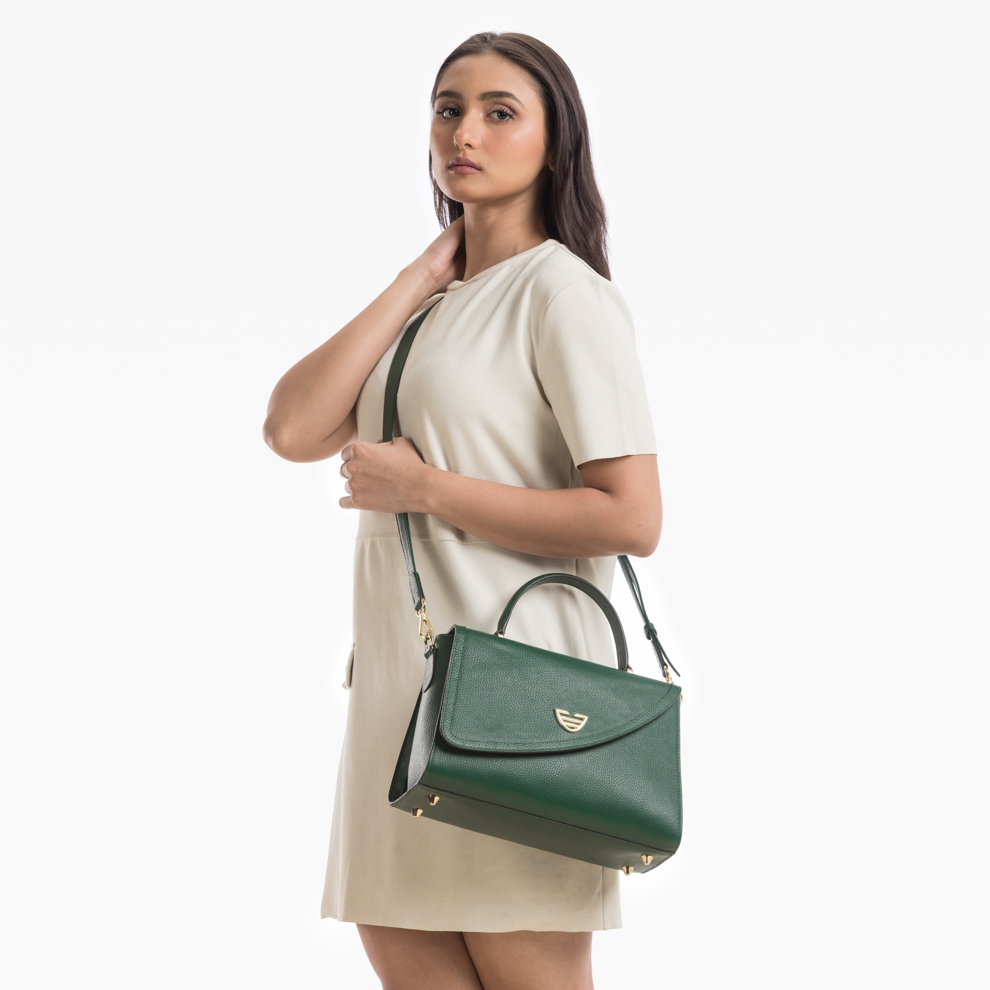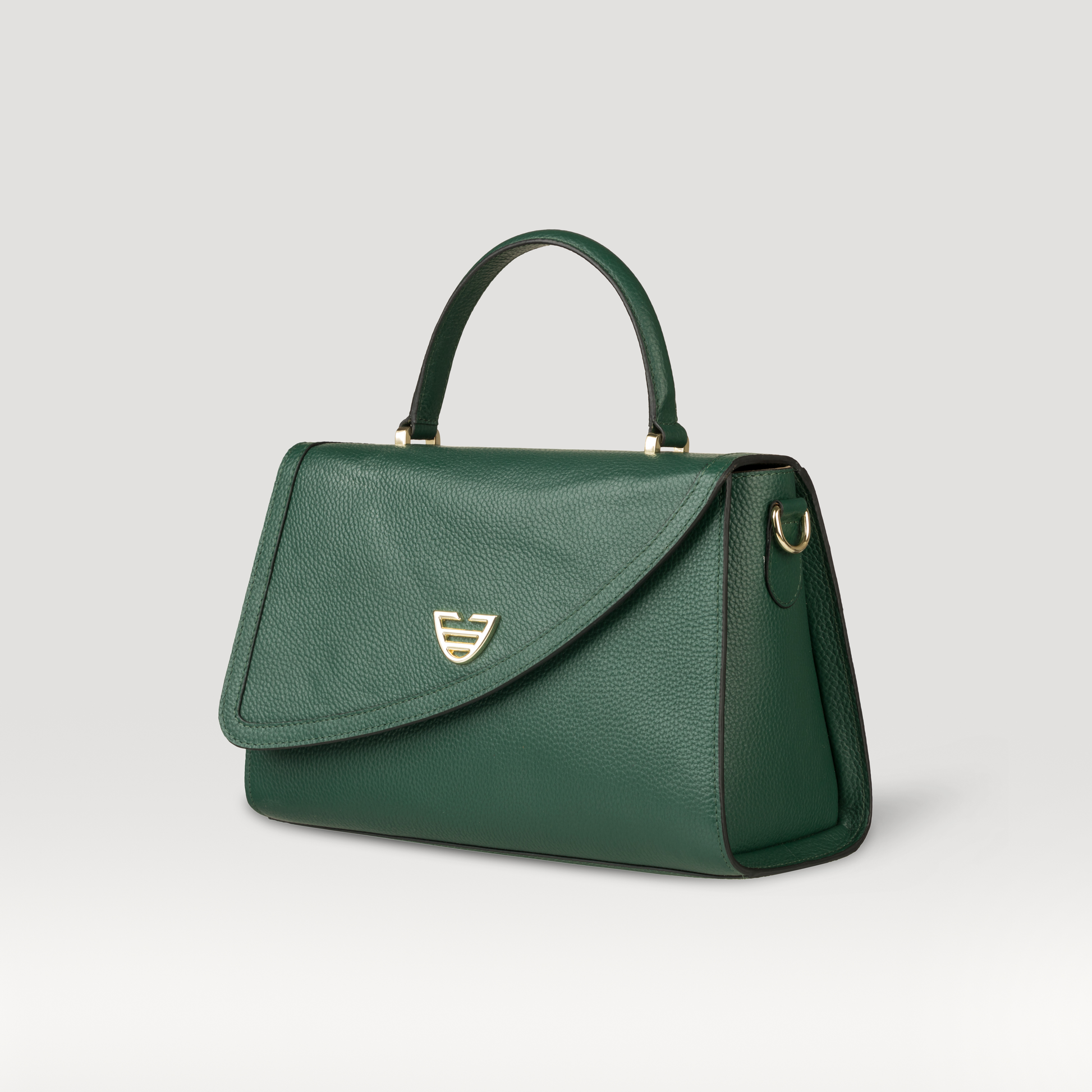 The Dignity Evergreen is a masterpiece of timeless sophistication. The distinctive Dignity curve flap is punctuated by a lustrous gold-tone DIRAMVI "Ladder Of Growth" emblem. Whether worn crossbody or carried by hand, it's sturdy construction makes a perfect combination of style and convenience. It comes with a magnetic lock and sized to fit everyday items, which includes phone, wallet, makeup essentials and keys.