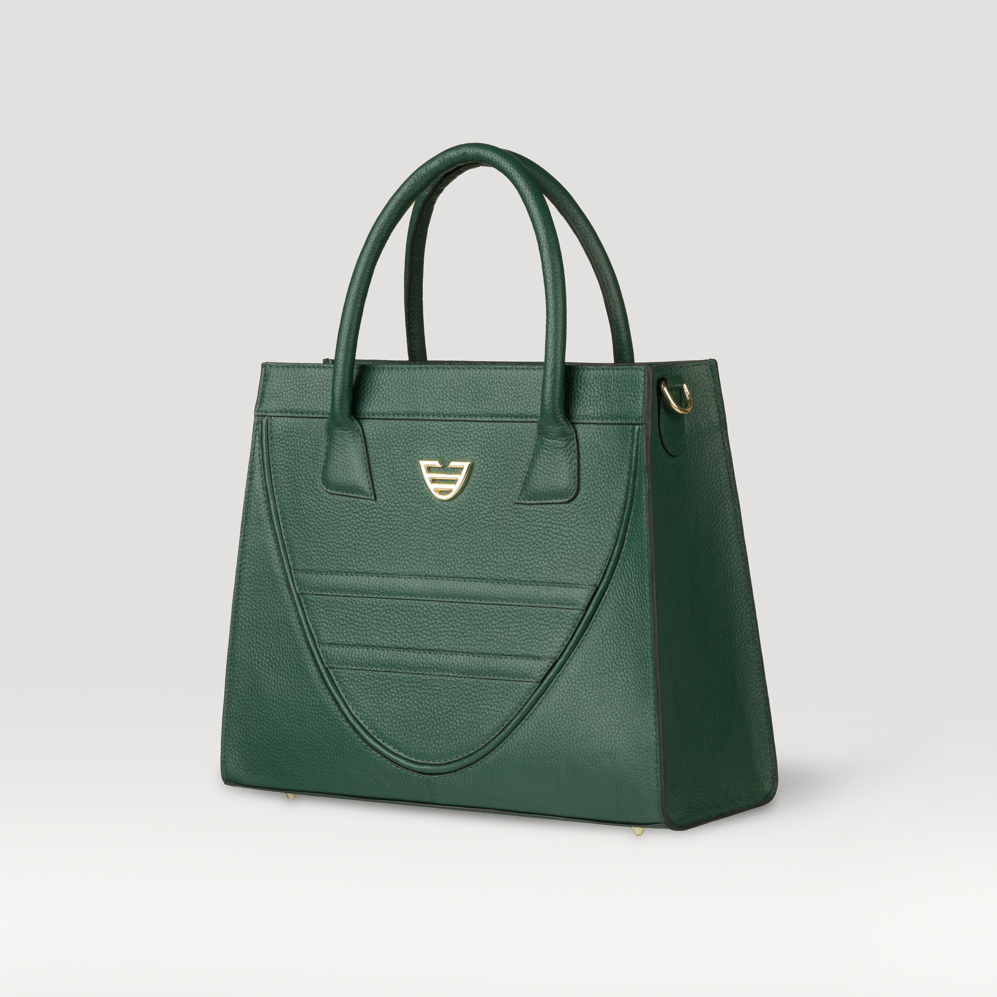 The Eterna Emerald Green is a masterpiece designed to transcend trends crafted from rich full grain pebbled leather with goldtone hardware. The design of the bag represents the DIRAMVI logo itself with a Diramvi "Ladder Of Growth" emblem on it with signature twin Diramvi unity handles. With generous capacity and with adjustable shoulder strap makes it easy to carry all your essentials for day to day life.